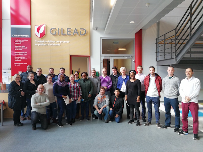Students from the Higher Certificate in Science in GMP & Technology and the Diploma in Biopharmaceutical Manufacturing Operations accompanied by Ann Toebes, went on a site visit to Gilead Sciences, Carrigtohill on Friday March 31st. Having studied GMP and the unit operations involved in Oral Solid Dosage processes, the class was looking forward to seeing the process in real life. On arrival the group was welcomed by Bernard Maguire the Associate Director of Manufacturing and Niall ODriscoll, a production engineer. We were given an overview of the company, the products it manufactures and details of the manufacturing processes. Next stop was the changing room where everyone washed their hands, donned hair nets, beard nets, bunny suits, shoe covers and finally safety glasses and gloves. After another hand wash we were led into the manufacturing area where we brought us through each of the unit operations from dispensing, blending, granulation, fluidised bed drying, blending, compression and finally tablet coating. Tablets manufactured on site are sent to the Packaging Department on site or abroad to another Gilead packaging facility.